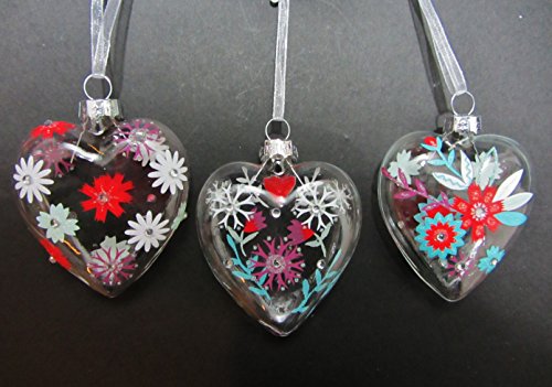 Stunning clear glass hand painted heart Christmas tree decorations. Featuring three different designs with gem detail. By the popular London Designer Gisela Graham. Size approx: 6cm x 7.5cm excluding hanger. May slightly vary to image.