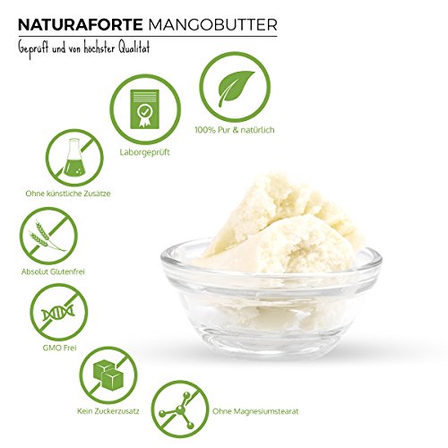 NaturaForte® mango butter Especially beneficial for dry, brittle and dehydrated skin. Mango butter is the vegetable oil extracted from the mango kernels. It is also referred to as mango seed oil. NaturaForte® mango butter contains many valuable vitamins, such as vitamins A, C, D, E and a vitamin B complex. Minerals such as magnesium, calcium, potassium and iron supplement the valuable saturated and unsaturated fatty acids with important nutrients. The wholesome oils protect and nourish the skin and make it supple and firm. Mango butter is a rich care - ideal for low-fat and dehydrated skin. ∙ vegan and without artificial additives ∙ Particularly nourishing & protective - moisturizes ∙ From the core of the mango ∙ 100% natural and pure - perfume free ∙ contains valuable vitamins Ingredients: 100% Mangifera indica Origin: Italy Note: Do not store above 35 degrees