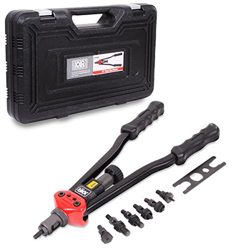 Professional quality heavy duty 13" [330mm] hand rivet gun. A must have kit for professional and home diy mechanics alike. Double compound hinges to maximise leverage. Ideal for working in hard to reach areas. Ergonomically designed handles for superior grip and ease of use. Supplied complete with 6 interchangeable nozzles. Long, lasting and durable construction for a long service life. Supplied complete as shown.