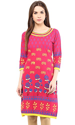 Look beautiful and fresh in this gorgeous pink printed kurti from Indi Dori. This 3/4 sleeve kurti features a contrast golden laced neck and an all over print on the body, giving it a smart look. About Indi Dori : Prides itself in presenting Indian ethnic casual wear for the global population. Mostly uses 100% cotton fabrics with prints and embroidery to enhance ethnic motifs and designs. Inspired designer wear at affordable prices for daily usage for all.