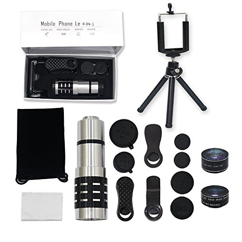 LIEQI Camera Lens kits,4 in 1 HD Universal Clip-On Phone lens, 12X Optical Zoom Telephoto Lens+15X Macro Lens+198°fisheye lens+0.63X Wide Angle Lens Tripod for iPhone Samsung Huawei Ipad Tablet PC
