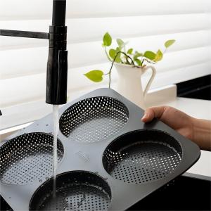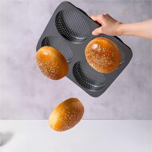 The HOMOMSAE Large Hamburger Bun Pan is a commercial-quality, 4-cavity carbon steel baking mold designed for perfect 5-inch buns. Its perforated base ensures even airflow and browning, while the heavy-duty, 3x thicker non-stick coating withstands temperatures up to 450°F without warping. Ideal for home chefs and small businesses, it includes patty papers, a silicone brush, and scraper for a complete baking experience.