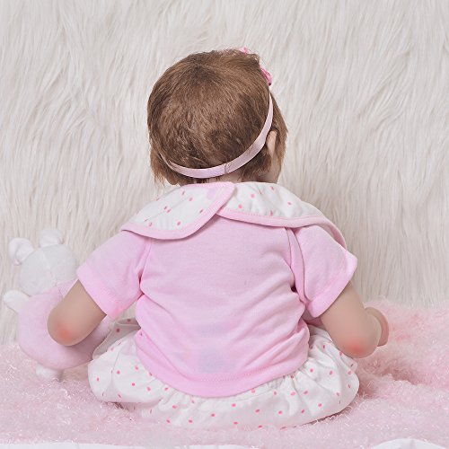 FeatureType: head and 3/4 limbs are soft silicone vinyl, 1/4 limbs and body are cloth with internal filling PP cotton, cloth body doll don't have sex.Size: 55 cm /22 inch;from head to toe, deviation exists due to different measuring ways. Hair: Hand rooted mohair (fabric made from the real hair of the Angora goat). The hair can be any shape and fixed, just like a real baby's hair, If the hair is a little messy, please use the special wig comb and take care of it gently.Eyes: big charming eyes, they are high quality acrylic eyes, bright and clear, real like the newborn baby's eyes, can't close or blink, some sleeping dolls have closed eyes, they can't open.Nose: the nostrils are open, just like breathing.very realistic.Face: painted by our artist and it becomes some little pink blush.Nails:the finger and toe nails are also painted 100% by hand-drawn for that manicured, look redness of the nail bed and translucent nails Skin: The skin is the most unique place this doll, designers will spend a lot of time to baby's skin looks more realistic multi-layer manufacturing Application:Children birthday gift;Christmas Gift; Girl friends birthday gift; Mother's gift; Kids playmate;For nursery;Holiday Gift; Collection.Gift:1. a magnet pacifier and a bottle2. a little plush Toy will be sent to you as a gift3. a randomly color blanket4. clothes, always same as picture, but sometimes when the clothes is out of stock, we will ship one similar one to you as gift , if you mind, please contact us before we ship your item out ! thanks5. we will package your baby doll in a gift box, so that you can give it to others as a gift directly