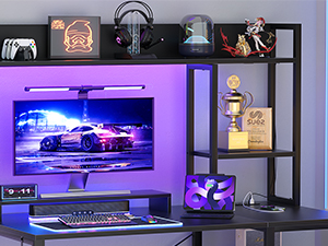 【Gaming Desk with Hutch】 Are you annoyed with the messy tabletop now? Our gaming desk with top hutch which is a perfect space to store your books, speakers and decorations. It connects the 5-tier side storage shelves all together increases more infinite storage space and keeps the desktop spacious and tidy. Such strong storage function will make everything arranged very well!