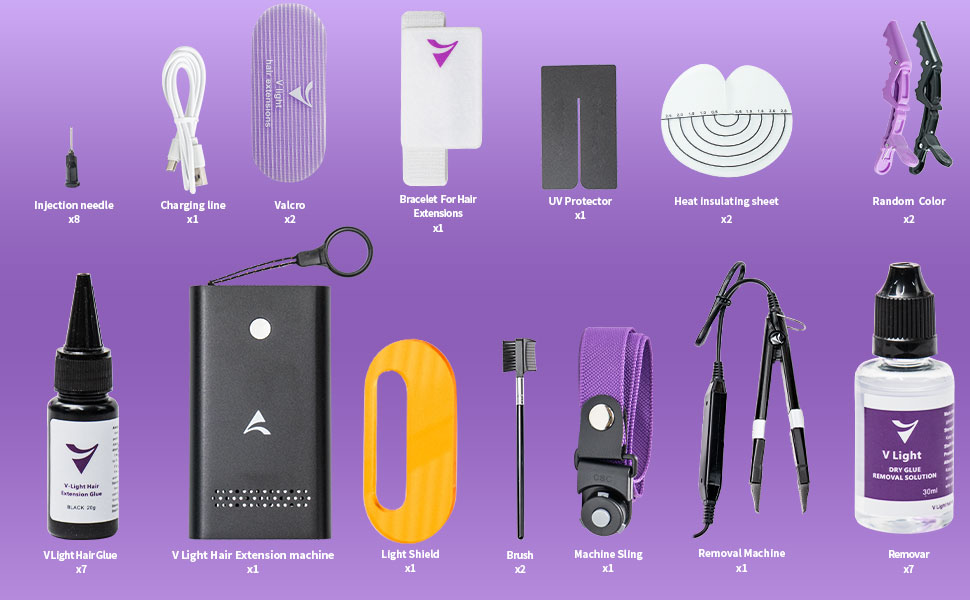 The v Light Hair Extension Machine Kit is a professional-grade tool set designed for fast, safe, and reusable hair extensions. Featuring a portable v-Light machine, quick-curing glue that bonds in 7-10 seconds, and the ability to apply a full head of extensions in just 30 minutes, this kit delivers long-lasting results for over 2 months, making it ideal for busy stylists and trend-conscious users.