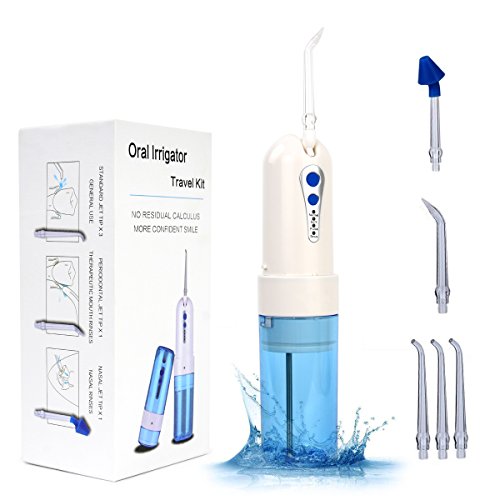 Attention: 1. Kindly note to pull out the tube when you use the water flosser. Make sure the bottom cover is twisted to the slot as picture shows,otherwise water can not be be sprayed out. 2. Charging 6 hours, it could last about 20 days if you use the water flosser one minute per day! Benefits of our Portable Water Flosser: 1)Easier and less abrasive than flossing. 2)Helps fighting with plaque and gingivitis. 3)Promotes healthier gums by flushing out bacteria from deep pockets along the gum line. 4)Promotes a cleaner mouth and prevents bad breath. 5)Especially effective in cleaning around braces, implants and bridgework. How to use our oral irrigator: 1) Pull off the water tank 2) Pull off the bottom cover 3) Pour warm water into the water tank 4) Pull out the suction pipe from the bottom of the machine 5) Mounted the water tank onto the machine 6) Bend upward the nozzle on the head of machine Spectification: 1) Material: PC 2) Water Tank Capacity: 200ml 3) Height: 16cm 4) Models: Low/High 5) Voltage: 5V Packing: 1) 1x Oral Irrigator 2) 1x USB Cable 3) 5x Replaceable Jet Tips 4) 1x Travel Bag