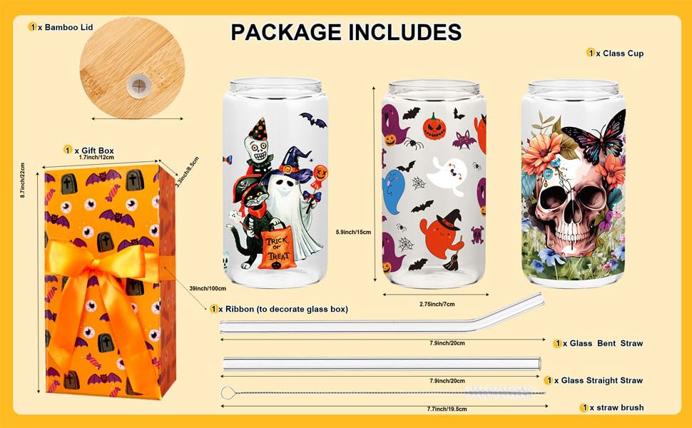 I love everything about this adorable glass cup. The images on the cup are just so cute and festive. They encircle the entire cup, so you will always have something cute to look at. It holds 16 oz of whatever you choose to put in there. I even love the orange box which it arrived in. I was so excited for Halloween after I opened this. It comes with a wooden lid, two straws, one straw brush, one ribbon, and one present box. This is a GREAT value for the price. I would highly recommend this.