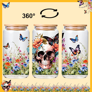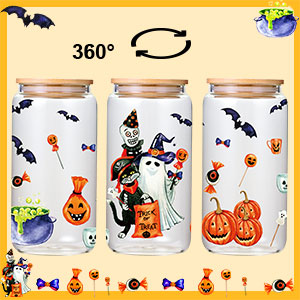 This 16 oz Halloween-themed glass tumbler features a vibrant 360° pumpkin and spooky design printed on durable tempered glass. It includes a spill-proof lid with a rubber gasket, two reusable straws, a straw brush for easy cleaning, and comes in a gift-ready box with ribbon—perfect for festive gifting and versatile everyday use with coffee, cocktails, or cold beverages.