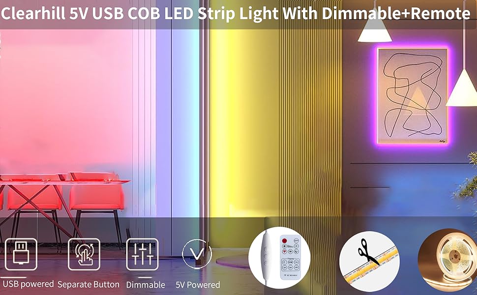 The Clearhill 5V USB COB LED Strip Light offers 3 meters of high-density 320 LEDs/m warm white (3000K) illumination with remote dimming and timing control. USB-powered for versatile plug-and-play use, its flexible, cuttable design fits any indoor DIY project. Ideal for creating seamless, eye-friendly ambient lighting in modern home or office settings.