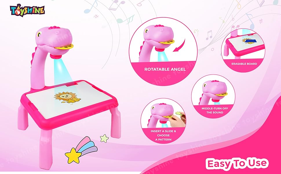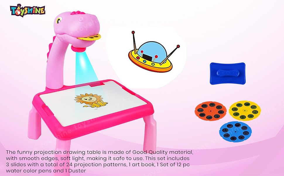 The Toyshine Dino Theme Smart Projection Drawing Board is a versatile, kid-friendly art projector designed for ages 3 and up. Featuring 24 projection patterns, adjustable image clarity, and detachable legs for flexible use, it encourages early learning through color recognition and creative thinking. The included watercolor pens, art book, and built-in music create an engaging, multi-sensory drawing experience that cultivates artistic skills and imagination.