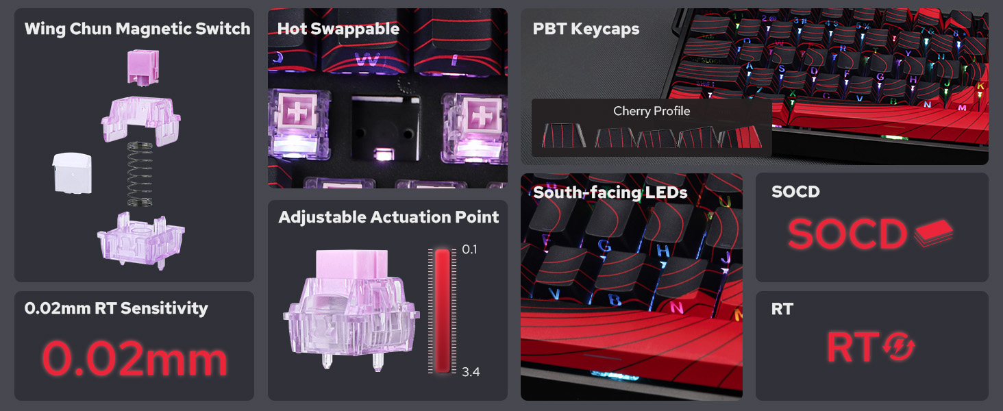 The AULA WIN60 HE is a wired 60% magnetic keyboard featuring Hall Effect switches with fully adjustable actuation points in ultra-fine increments, an ultra-low 0.3ms latency with an 8000Hz polling rate, and a compact design optimized for FPS gaming. Its hot-swap capability, dynamic keystroke tech, and vibrant RGB lighting make it a top-tier choice for professionals seeking speed, customization, and durability.