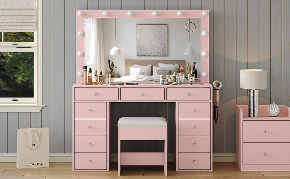 This 11-drawer vanity desk combines Hollywood-style adjustable lighting, integrated power outlets with USB ports, and ample storage to create a sleek, organized, and luxurious makeup station. Designed for millennials who value both aesthetics and functionality, it includes a cushioned stool and a large HD mirror, making it perfect for home, salon, or live streaming setups.