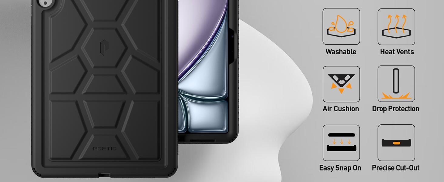 The Poetic TurtleSkin Case for iPad Air 11 Inch 2024 is a heavy-duty, shockproof silicone cover designed specifically for the iPad Air 6th Generation. It features a unique turtle shell design for enhanced grip and drop protection, is made from kid-friendly materials, and includes cooling air vents to prevent overheating. This case is perfect for parents looking for a durable and stylish solution to protect their devices.