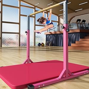 The MEKETUM Gymnastic Kip Bar for Kids features a stable triangular iron frame with adjustable height, designed to support safe and professional gymnastics training. Ideal for unisex teens, it includes gymnastic rings and withstands active use like swinging and climbing, making it a perfect gift for growing kids.
