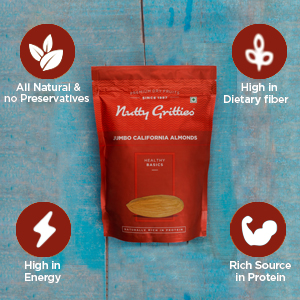 Nutty Gritties California Almonds Badam Raw 500g offers jumbo, crunchy Sanora variety almonds rich in 20g protein and Vitamin E per 100g. Perfect for morning consumption, this vegan and keto-friendly snack supports muscle building, immune health, and digestion. Certified for quality and safety, it’s an ideal addition to smoothies, salads, or enjoyed soaked for optimal nutrition.